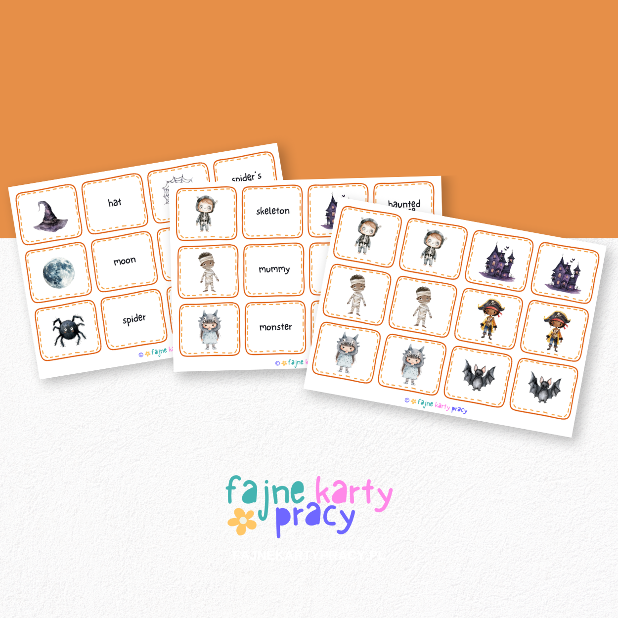 - 22 pary obrazek-obrazek oraz obrazek-podpis po angielsku w formacie standardowym (12 kart na A4) oraz XXL (1 karta na A4): bat, black cat, broom, cauldron, clouds, ghost, hat, haunted house, Jack-o’-lantern, lantern, monster, moon, mummy, pirate, pumpkin, raven, skeleton, spider, spider’s web, vampire, witch, zombie