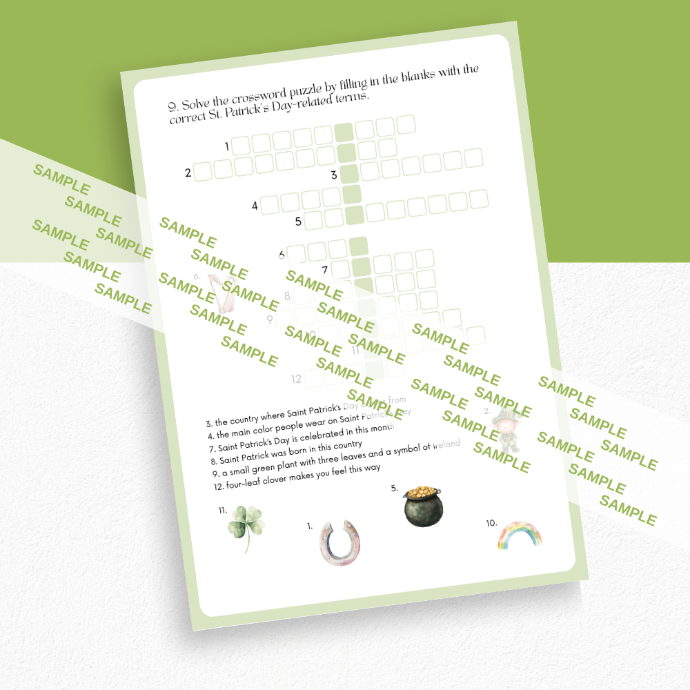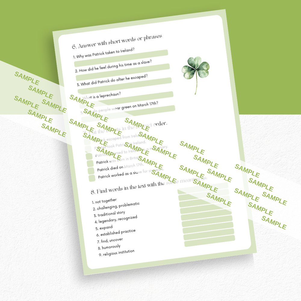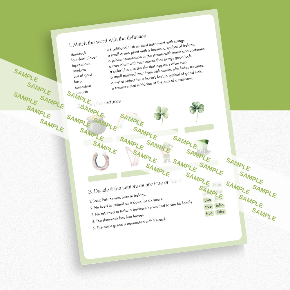 Zestaw kart pracy poświęcony tematyce Saint Patrick’s Day, przeznaczony dla uczniów na poziomie A2–B1. Materiał umożliwia przeprowadzenie pełnej lekcji okolicznościowej opartej na czytaniu ze zrozumieniem oraz pracy ze słownictwem tematycznym.
