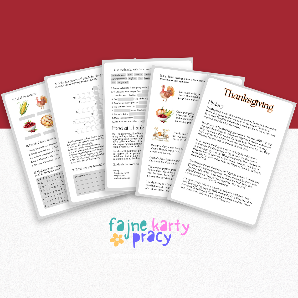 Materiały są gotowe do użycia, idealne na lekcje w tygodniu Thanksgiving – zarówno w klasie, jak i podczas zajęć online. Otrzymasz plik PDF do druku. Uczniowie poznają słownictwo w przyjemny sposób, a Ty zyskujesz gotowy materiał, który pozwoli Ci zaoszczędzić czas na przygotowaniach.